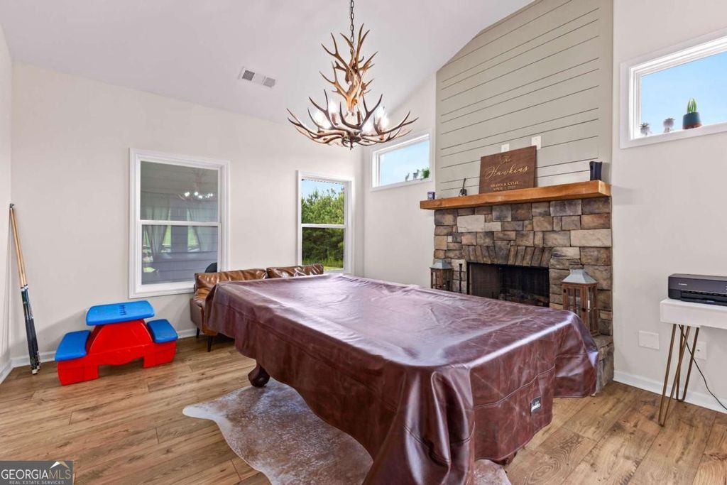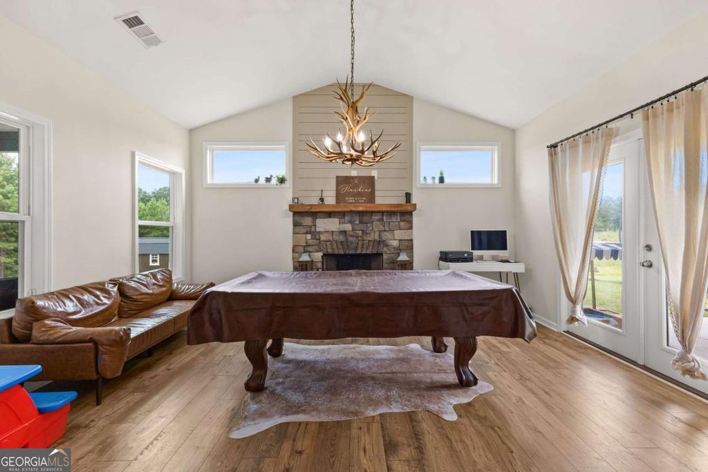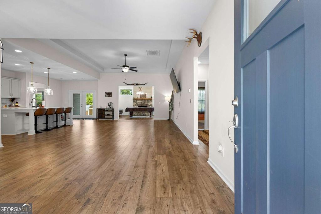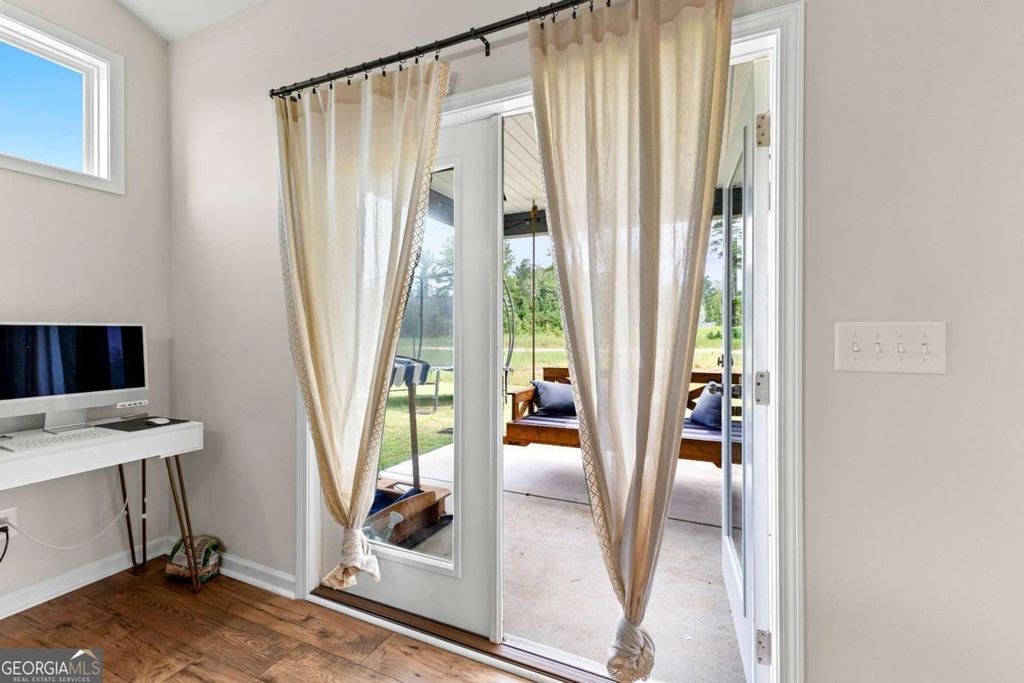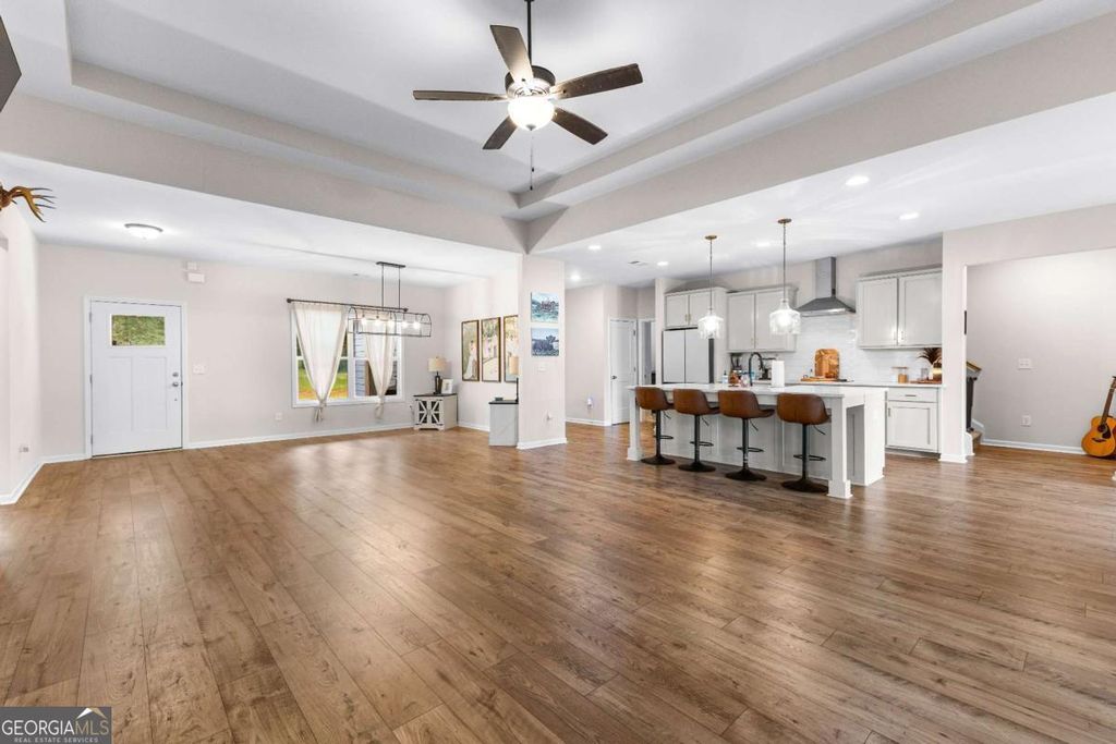 This beautiful ranch style home sits on 7.7+/- acres and boasts an open-flow design, featuring a seamless transition from the family room to the kitchen and dining area. The dining area is highlighted with accent trim details, adding a touch of elegance. The kitchen is equipped with beautiful shaker-style cabinetry, built-in stainless steel appliances, and a stylish tile backsplash. A standout feature of the home is the Keeping Room, which includes a fireplace with designer selections and an abundance of natural light. The split bedroom layout offers privacy, with a spacious master suite that includes a large closet and a luxurious master bath featuring a designer-tiled shower, garden tub, and double vanity. Two guest rooms on the main level share a secondary bathroom, while upstairs you'll find an additional bedroom and bathroom, perfect for guests. The home also includes a covered back patio and a separate covered sitting area, ideal for outdoor relaxation.