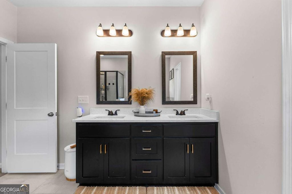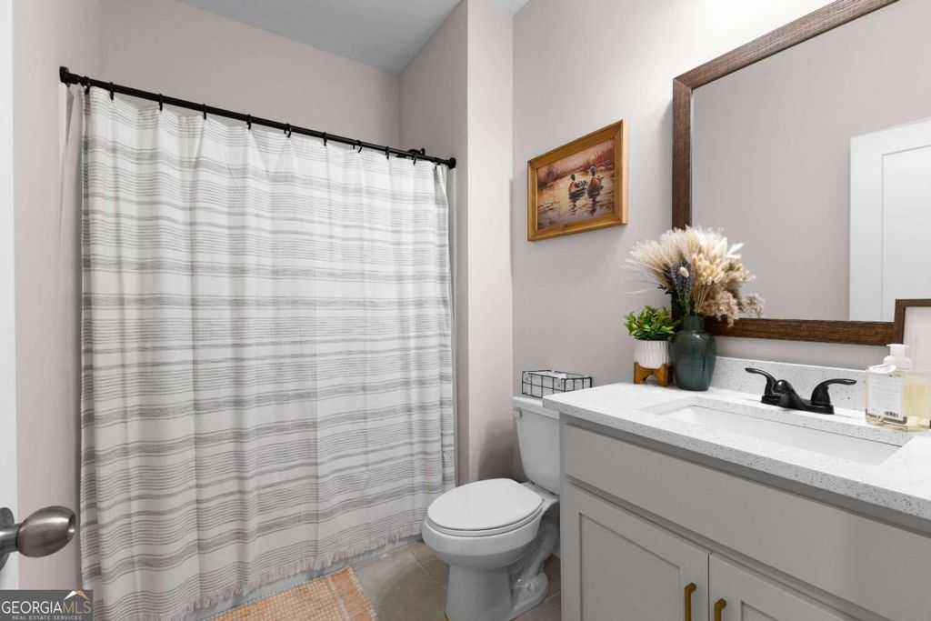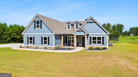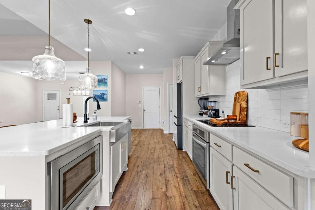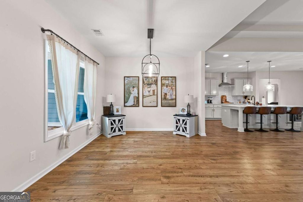 This beautiful ranch style home sits on 7.7+/- acres and boasts an open-flow design, featuring a seamless transition from the family room to the kitchen and dining area. The dining area is highlighted with accent trim details, adding a touch of elegance. The kitchen is equipped with beautiful shaker-style cabinetry, built-in stainless steel appliances, and a stylish tile backsplash. A standout feature of the home is the Keeping Room, which includes a fireplace with designer selections and an abundance of natural light. The split bedroom layout offers privacy, with a spacious master suite that includes a large closet and a luxurious master bath featuring a designer-tiled shower, garden tub, and double vanity. Two guest rooms on the main level share a secondary bathroom, while upstairs you'll find an additional bedroom and bathroom, perfect for guests. The home also includes a covered back patio and a separate covered sitting area, ideal for outdoor relaxation.